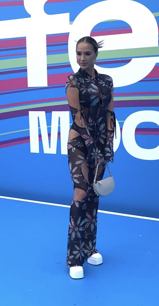 Для своего выхода Алина выбрала полупрозрачный с цветочным принтом комбинезон, который дополнила эффектной прической и белой сумкой. К слову, не так давно Валя Карнавал в таком же аутфите появилась на премии RU.TV. Чей лук получился круче? Голосуй в конце статьи!