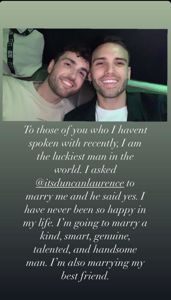 «Я самый счастливый мужчина на свете: я сделал предложение Дункану, и он ответил да. Никогда еще я не был так счастлив в своей жизни. Я выхожу замуж за умного, талантливого, гениального и мужественного человека. И также я выхожу замуж за своего лучшего друга», — написал Джордан.
