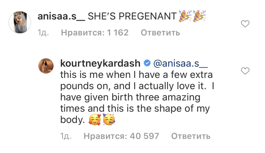 Кортни же призналась, что просто поправилась на несколько килограммов. «Я выгляжу так, когда поправлюсь на несколько килограммов. Я себе сейчас нравлюсь. Я рожала три раза, теперь форма тела у меня такая», – написала она.