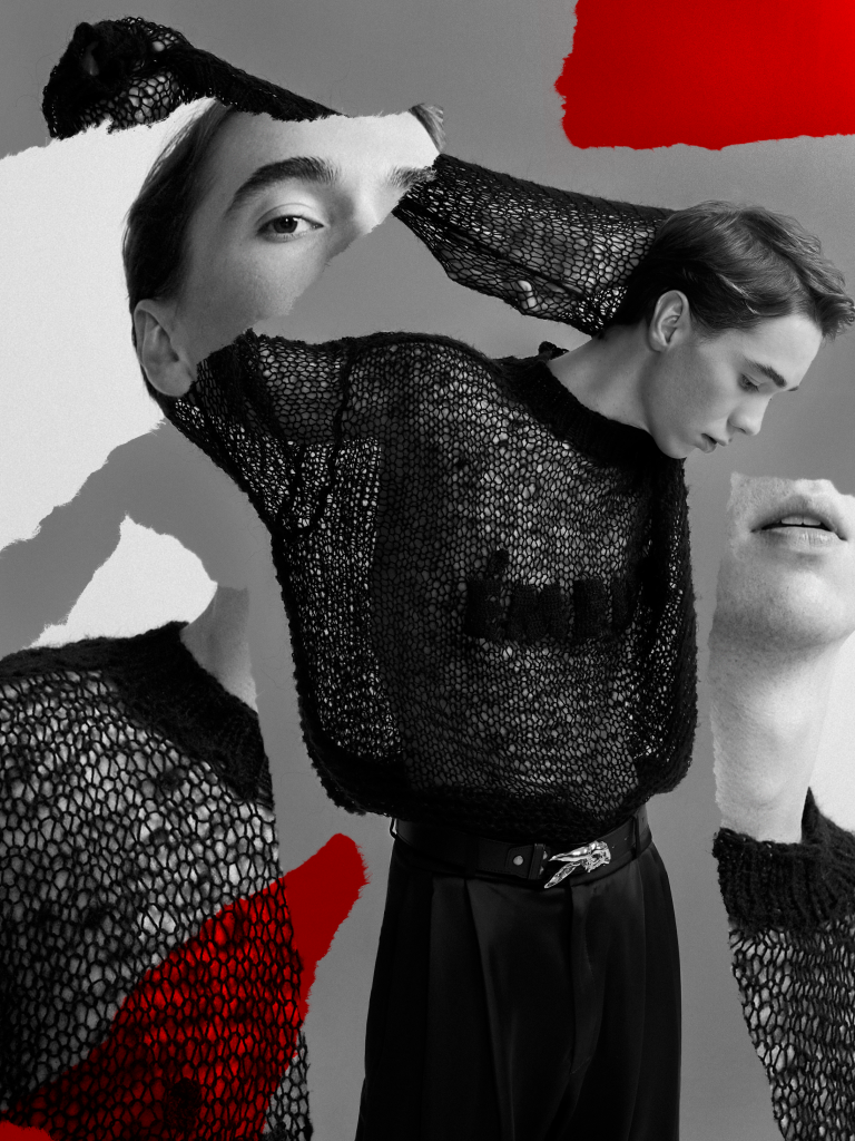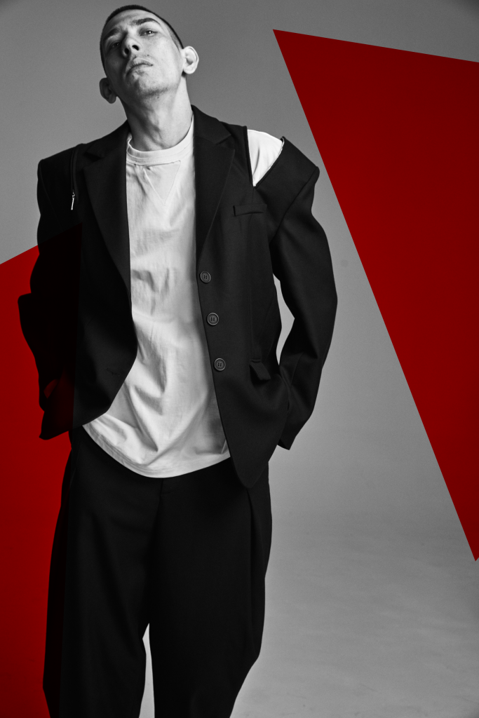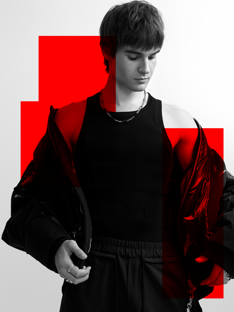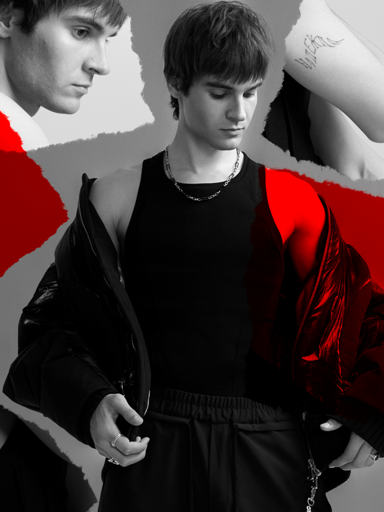 Майка и бомбер — Chernim Cherno, брюки — NONAMECONCEPT, ботинки — VIC MATIE (noone.ru), украшения собственность героя.