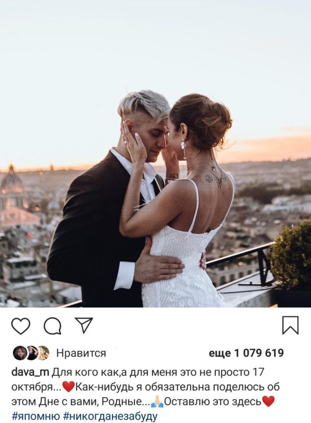 На третьем месяце знакомства я организовал поездку в Рим. В самом центре города есть крутая гостинца. Вид на весь Рим. У нас был романтический квест по всему городу. Нужно ходить по самым красивым местам, разгадывать загадки… Вечером меня «украли». Чтобы она попала ко мне, нужно было на вопросы ответить, буквы вставить, отгадать слово «Лайкер» (пара познакомилась на съемках этого клипа – прим. ред.). И она отгадала. Поднялась на последний этаж. Закат, итальянский скрипач… Я чуть не плачу, так красиво он играл. Я подготовил ей платье. Тем ключом, который я ей подарил, она открыла сундук, а там была колба с запиской «Выходи за меня». Кольцо было от Tiffany: думал, что оно должно быть самым дорогим. Записал, кстати, все на видео. Когда пересматриваю, думаю, какой же я… что я несу!