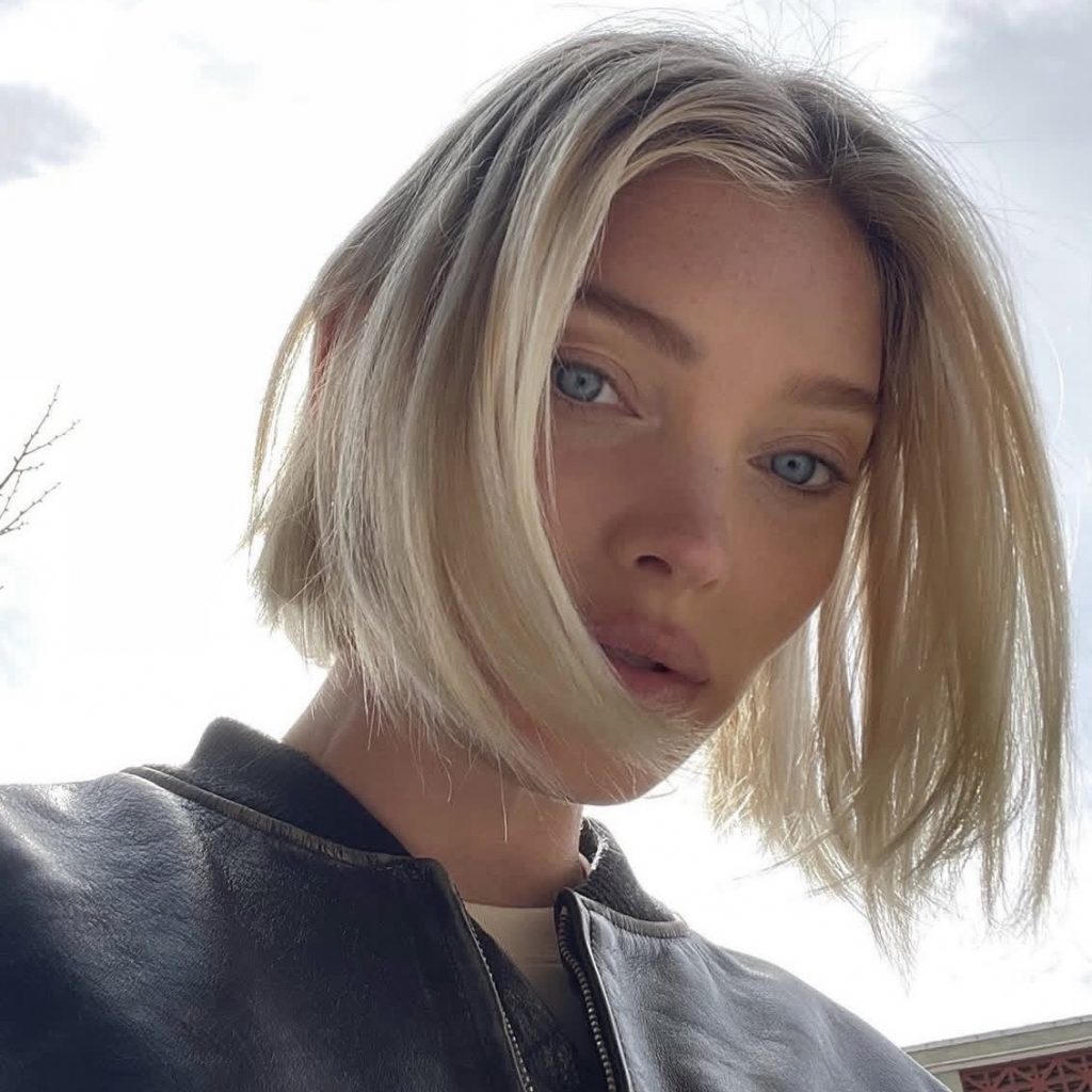 Это скульптурированная стрижка, доходящая до подбородка. Благодаря четкой форме и едва заметным обрамляющим передним прядям прическа выглядит графичной. Главная особенность образа – идеально прямые локоны без намека на небрежность.