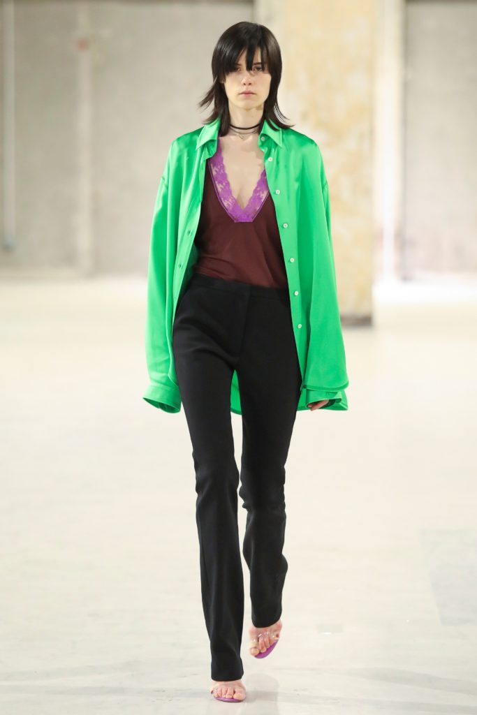 Да, тот самый зеленый цвет с показов Bottega Veneta и Louis Vuitton сохраняет свою актуальность и в новом сезоне и находит отклик в коллекциях других брендов. Так что вполне ожидаемо, что в лукбуке Stand мы увидели салатовую юбку плиссе, на показе Miu Miu в горах – яркую балаклаву, а у Atlein – рубашку.