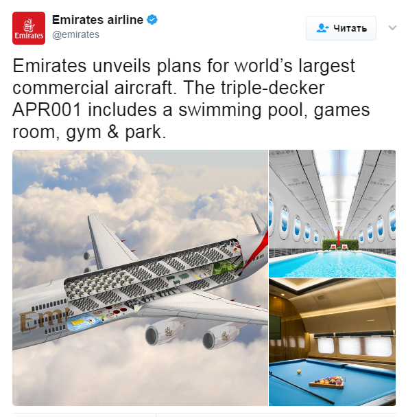 Авиалинии Эмиратов подхватили флешмоб с самолетными розыгрышами и заявили, что у них есть рейс с огромным бассейном и бильярдным столом прямо в самолете. Нам кажется, они слишком жестоко шутят!