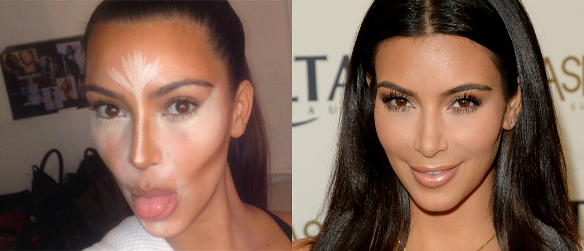 Хайлайтер на верхнюю часть скул, подбородок, и область между бровями, бронзовые румяна, плотный тональный крем – и теперь все это тщательно растушевать (называется контуринг). На лице, конечно, образуется маска, но зато фотографии получаются просто идеальные.