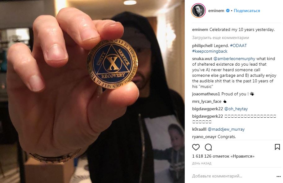 Рэпер поделился фотографирей медальона, который ему дали в рехабе в честь этой даты: «Отпраздновали мои 10 лет вчера», — написал он.