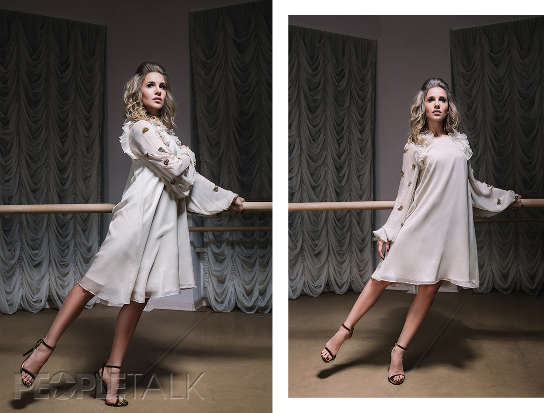 И вот, она примеряет наш первый образ: боди и юбка-пачка. Юля стройная и хрупкая. Показывает несколько балетных па – дурачится. Рядом с ней можно расслабиться (хотя команда мужчин на площадке, как по струнке, покидает зал, когда она голосом педагога, который мог бы безжалостно растягивать на шпагат, просит их выйти. Потом, конечно, смеется: «Шустро они»).