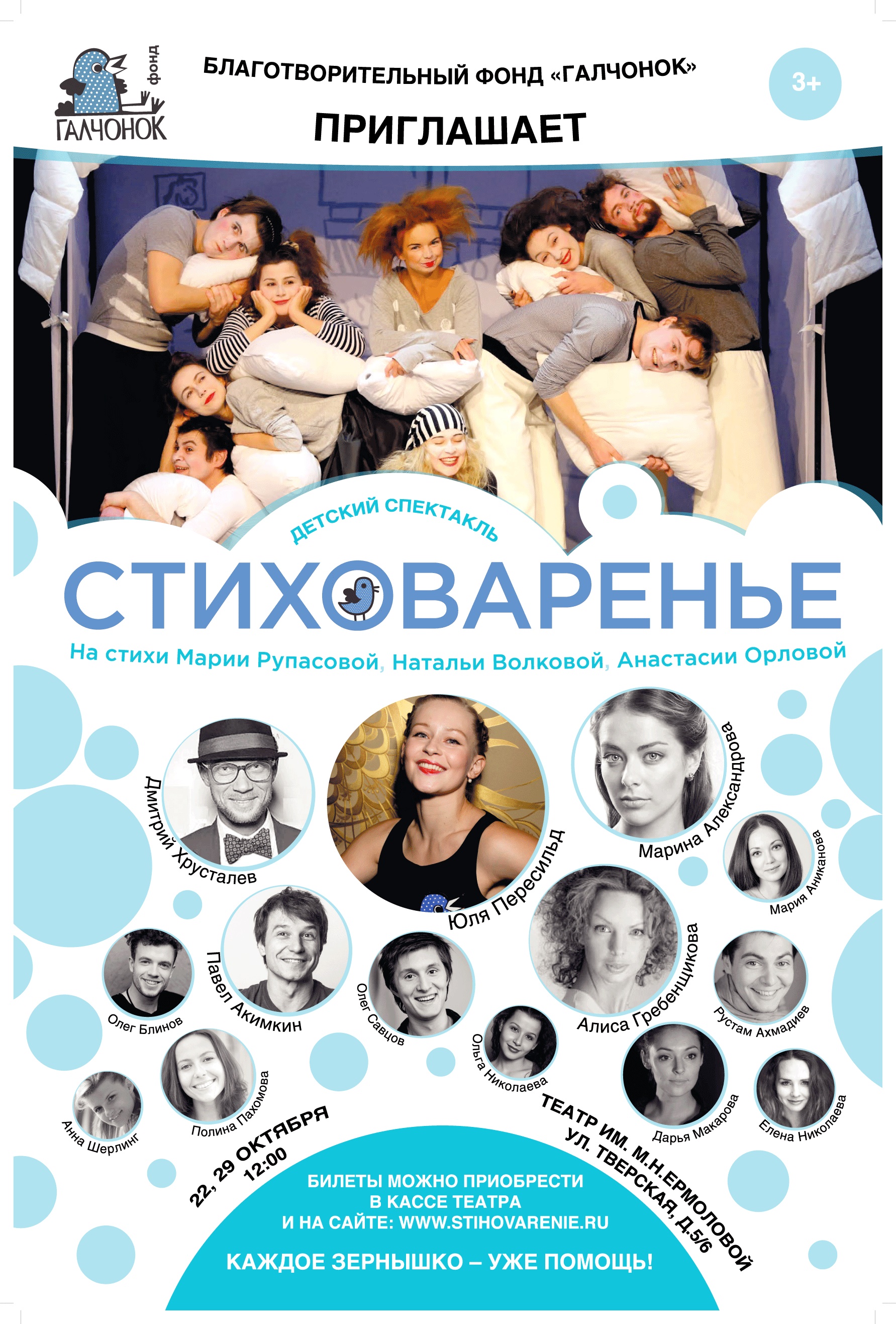 22 и 29 октября на сцене театра им. М.Н. Ермоловой будет открыт новый сезон благотворительного спектакля «СтихоВаренье», который создала актриса Юлия Пересильд (32), попечитель фонда «Галчонок». В постановке также примут участие Дмитрий Хрусталев (37), Алиса Гребенщикова (38), Кристина Асмус (28) и другие известные артисты.