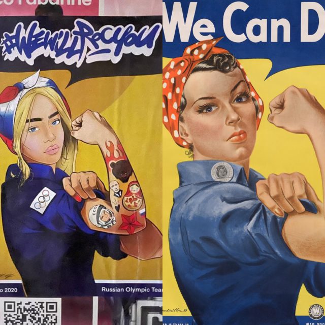 «Олимпийскую» версию постера придумал и воплотил русский уличный художник – Zak MINI Monster. В современной адаптации он изобразил девушку с платком в цветах российского флага и с татуировками узнаваемых «символов» России для иностранцев: Владимира Путина, матрешки и, конечно, медведя.