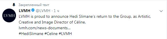 О назначении Слимана в своем Twitter сообщили представители транснациональной компании LVMH, которой принадлежит бренд. Они написали: «LVMH с гордостью объявляет о возвращении Эди Слимана в группу, как художественного, творческого и имидж-директор Cеline».