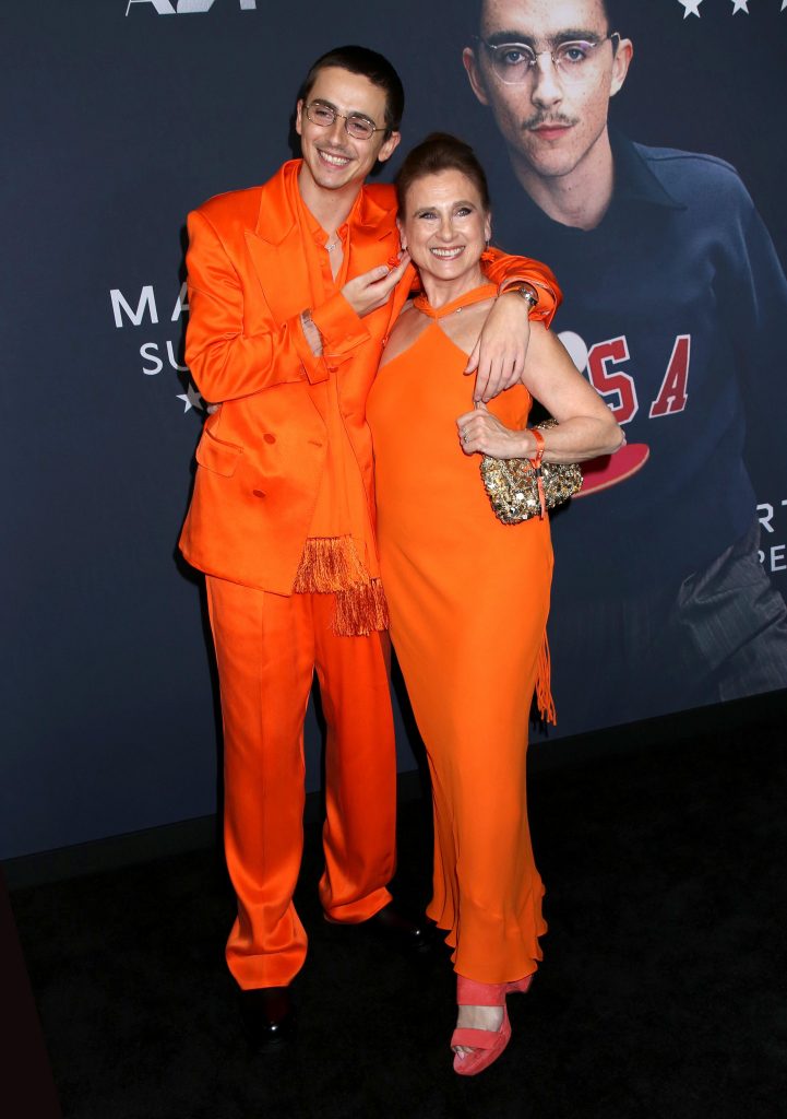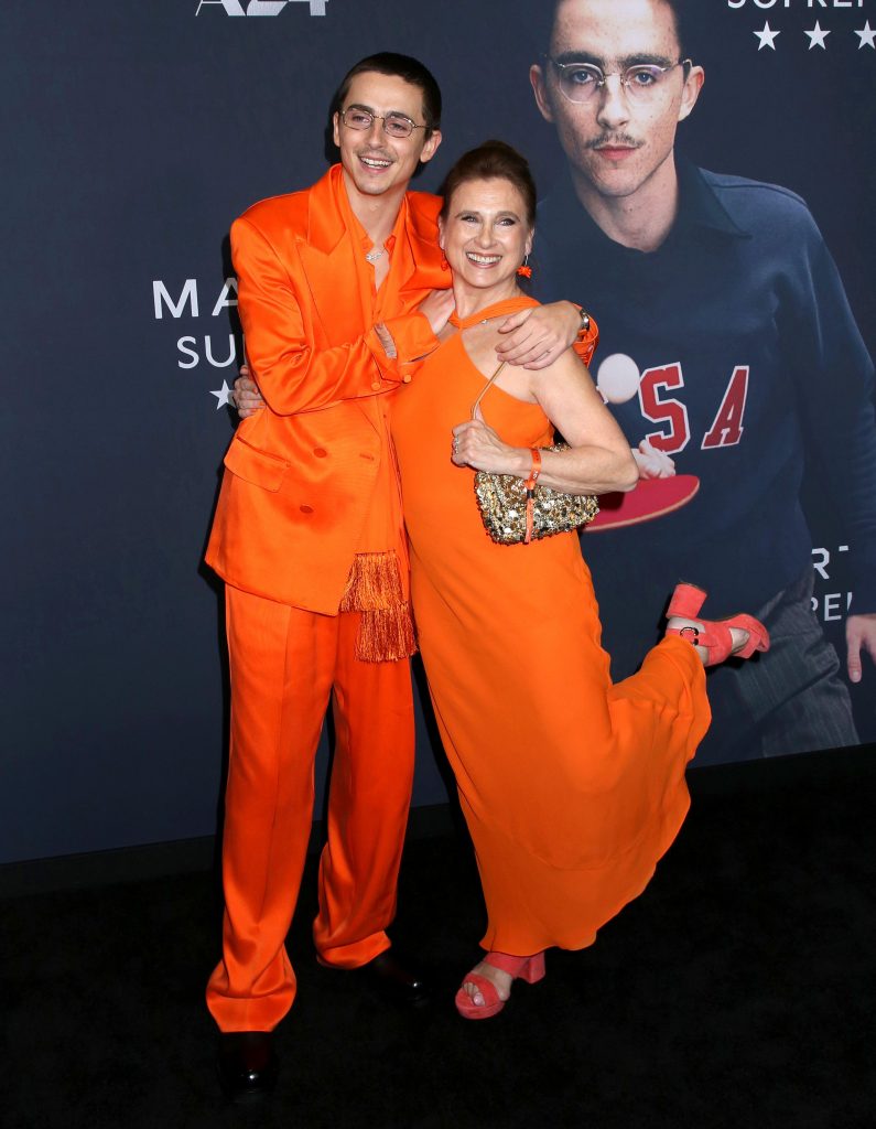 Беда пришла откуда не ждали: Тимоти Шаламе нашел замену Кайли на очередной ковровой дорожке премьеры фильма «Марти Великолепный». На этот раз актер появился не с возлюбленной, а с мамой – Николь Флендер. И все бы ничего, но главным цветом снова стал оранжевый. Конечно, семейный тотал-оранж выход не избежал сравнений с парным. Для премьеры в Нью-Йорке прошлый оранжевый костюм Chrome Hearts остался дома – предпочтение было отдано комплекту Tom Ford авторства Хайдера Аккермана. Мама актера поддержала выход расслабленным шелковым платьем в тон, дополнив образ сияющей сумкой.