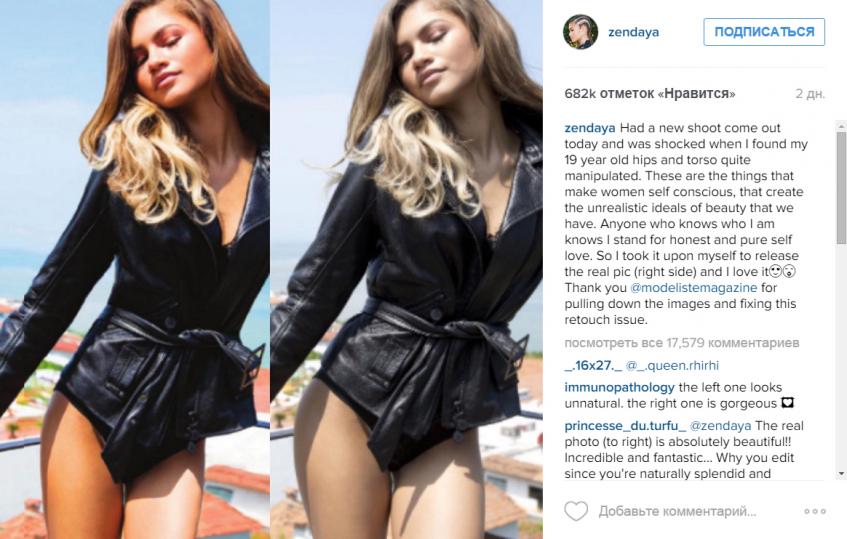 Свой манифест девушка опубликовала в Instagram, выложив две фотографии: одна с обработкой, а вторая без. «Если бы сегодня вышла новая публикация, я была бы потрясена. Фоторедактор очень сильно поработал над моими 19-летними бедрами и телом. Это то, что делает женщин закомплексованными и создает нереальные идеалы красоты. Тот, кто знаком со мной, знает, что я за честную и чистую любовь к себе… Спасибо Modeliste Magazine за то, что убрали эти изображения и обратили внимание на вопрос ретуши», — добавила девушка.