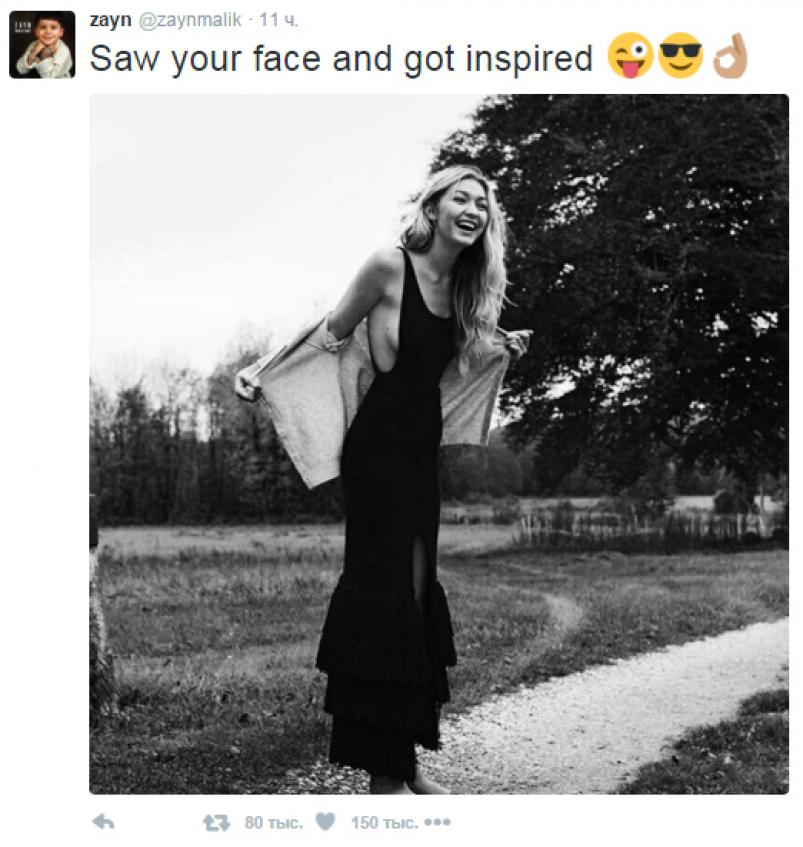 Именно в соцсети певец опубликовал фото своей возлюбленной, оставив под черно-белым снимком трогательную подпись: «Вижу твое лицо и вдохновляюсь». Кроме этого Зейн сопроводил запись несколькими игривыми смайликами, поэтому до сих пор не ясно, была ли это шутка, или музыкант просто находился в хорошем расположении духа.