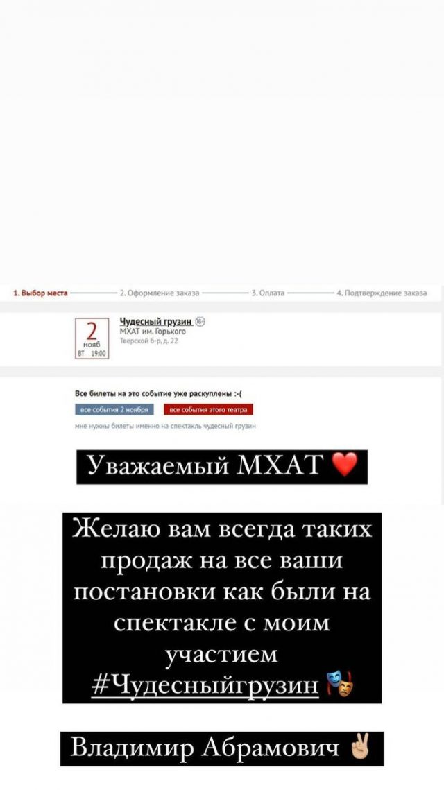 «Уважаемый МХАТ»(здесь и далее пунктуация и орфография сохранены – Прим. ред.), — обратилась телеведущая. «Желаю вам всегда таких продаж на ваши постановки как были на спектакле с моим участием», — подписала Stories Бузова.