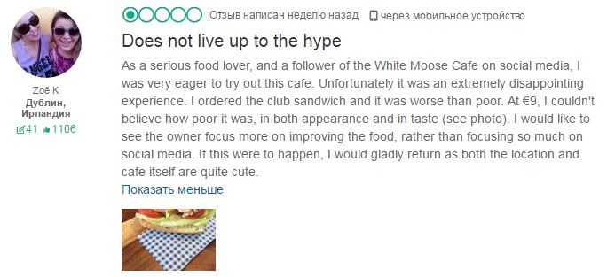 Недавно на туристическом сайте TripAdvisor девушка по имени Зои оставила негативный комментарий о кафе The White Moose Cafe (Дублин, Ирландия).