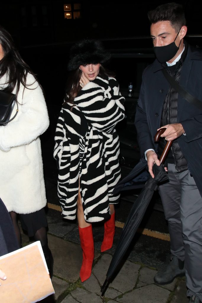 В последнее время Эмили Ратаковски стала часто радовать поклонников стильными образами. На этот раз она появилась в Лондоне на презентации своей книги «Мое тело» в пальто и юбке зебрового принта. Модель выбрала очень контрастные красные сапоги и дополнила образ меховой панамой.