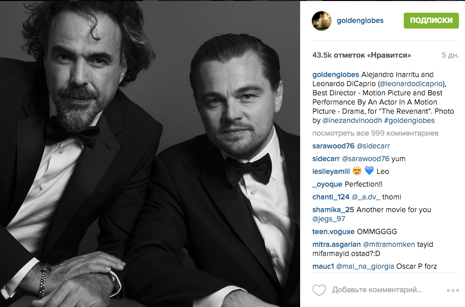 В это же время в официальных аккаунтах премии в Instagram и Twitter @goldenglobes началась трансляция. Разумеется, этим уже никого не удивишь. Но, что примечательно, победителей практически сразу после вручения награды провожали в специальную студию, где известные фотографы Инез Ван Ламсвеерде и Винуд Матадин снимали их портреты, которые сразу же появлялись в Instagram «Золотого глобуса». То есть постановочные фото, как у нас любят говорить, журнального формата появлялись в Сети уже через несколько минут после вручения статуэтки. Вот это уровень! Не говоря уже о том, что пользователи Facebook могли задавать вопросы победителям, ответы на которые можно было услышать в перископе.