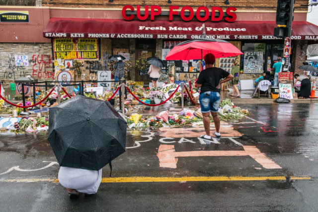 По пути к церкви стоял стол с масками черного цвета. На них надписи: «Жизни черных имеют значение». На соседнем столе лежали футболки с изображением Флойда (по 20 долларов).