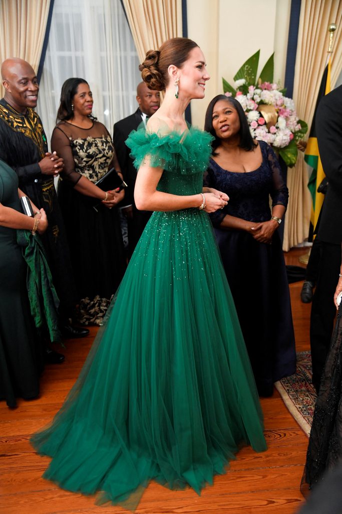 Вчера состоялся финальный ужин герцогов Кембриджских в рамках их тура по Карибским островам в честь платинового юбилея Елизаветы II. Для него Кейт выбрала невероятной красоты бальное платье Jenny Packham изумрудного цвета, которое было украшено сверкающими кристаллами.