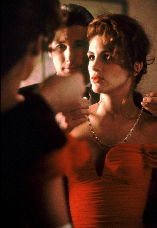 Пиком трансформации Вивиан Уорд стало эффектное вечернее платье в пол, одно из самых знаковых в истории кино вообще. Красный цвет, глубокое декольте в форме сердца, белые атласные перчатки и, конечно, бриллиантовое колье за 250 тыс. долларов, подаренное героине ее спутником, – и вот перед нами настоящая леди, достойная своего компаньона, плачущая во время оперы, но все так же забавно смеющаяся, когда по ее руке хлопает коробка с бесценным украшением (факт, что эта сцена вышла случайно, но благодаря искренней реакции актрисы вошла в окончательный монтаж).