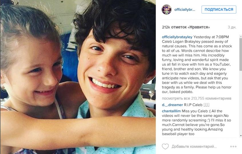 1 октября в возрасте 13-ти лет скончался начинающий видеоблогер Калеб Логан из семейства Брэталей, прославившегося благодаря собственному каналу на YouTube, где все члены семьи в шутливой манере рассказывают о делах и домашних неурядицах.