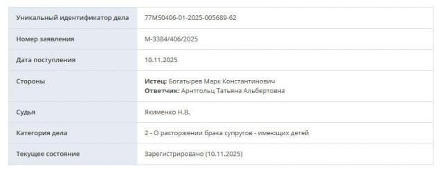 Марк Богатырев и Татьяна Арнтгольц официально завершают свой брак. Актер подал заявление о разводе 10 ноября, заявление появилось на официальном портале судов общей юрисдикции города Москвы.