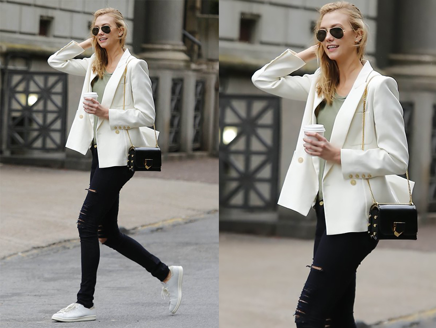 Белый в этом сезоне в фаворе. Просто заменив привычный черный жакет на белый, как сделала Карли Клосс, ты получаешь повседневный, но нескучный образ. Надевай жакет с черными джинсами, легинсами или классическими бойфрендами. Желательно с белыми кедами.