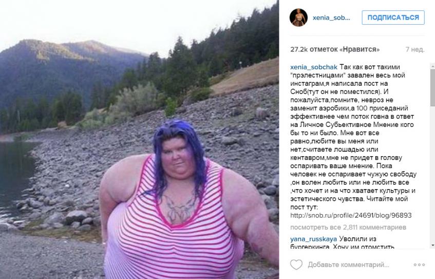 Телеведущая и редактор журнала L'Officiel всегда в центре событий. Совсем недавно Ксения заявила, что не любит «жирных». Конечно, это заявление взорвало соцсети. Собчак принялись критиковать не только ее подписчики, но и знаменитости. И устроили против нее настоящий флешмоб. Кстати, мягко говоря, упитанным назвали подписчики и мужа Ксении. А Анфиса Чехова, например, посоветовала Ксюше родить детей и успокоиться. Причем Ксения выразила свою позицию не только в Instagram, но и на сайте издания «Сноб».