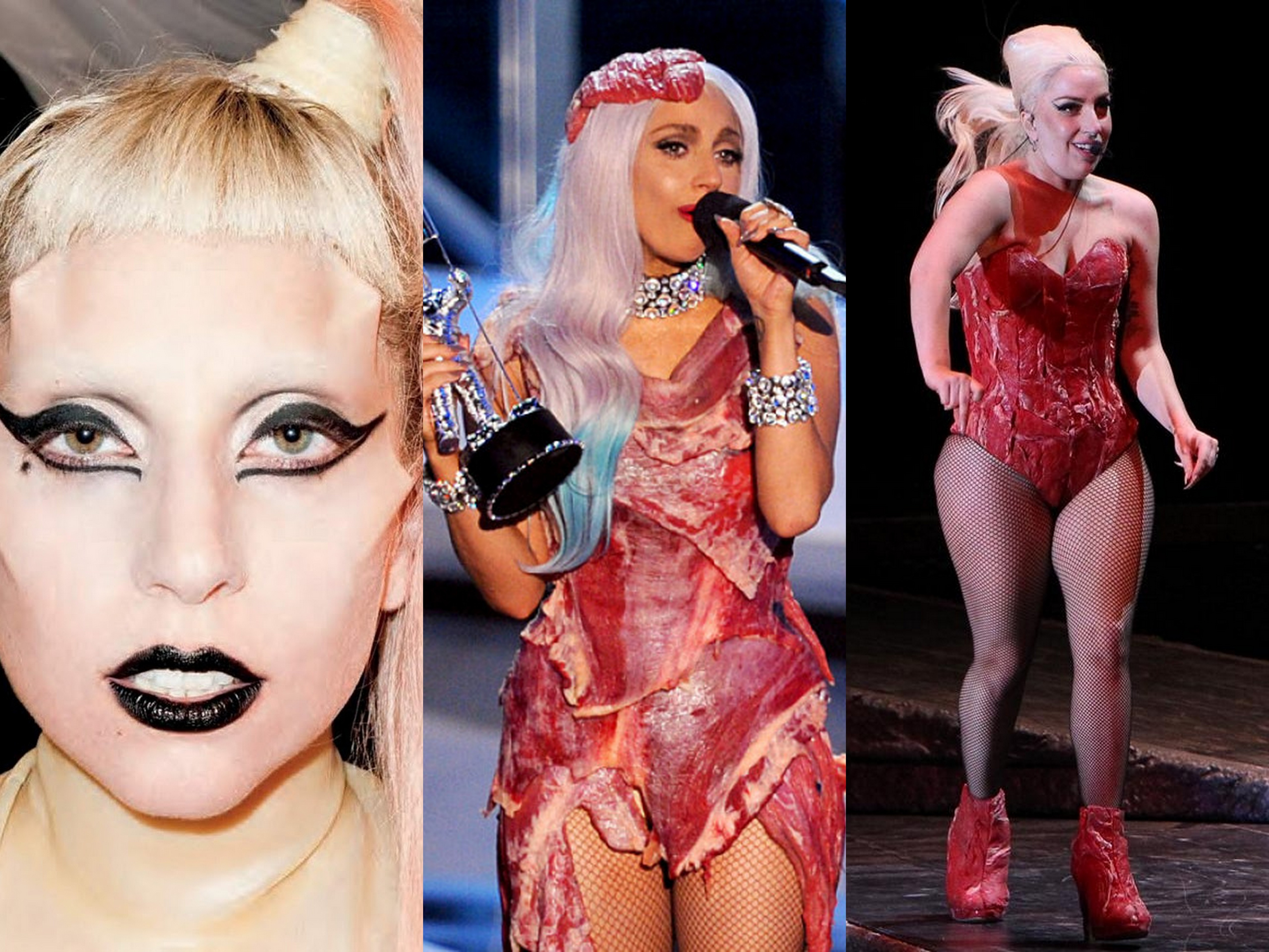 Эта девушка ворвалась в индустрию шоу-бизнеса именно благодаря своим нестандартным нарядам, большому носу и броскому макияжу. А еще поклонников покорили ее безумные танцы и шокирующие выходы на красную дорожку, например, в платье из мяса. Действительно, пока Гага (29) была Стефани Джоанн − обычной девушкой в джинсах, джемпере и с темными волосами, лавры суперзвезды ей и не снились. Так почему бы не закупиться шашлыком и не сделать из него шляпку?